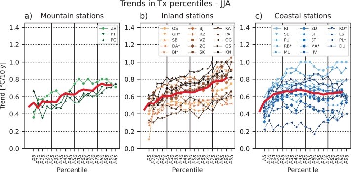 Detaljna analiza promjene temperature zraka pokazala je da se cjelokupna distribucija temperature na svim postajama pomiče prema višim vrijednostima. Pritom promjene nisu prostorno ujednačene na području Hrvatske, nego se izdvajaju dva glavna obrasca: jedan karakterističan za obalne, a drugi za kontinentalne postaje. Na kontinentalnim postajama porast tempertaure najizraženiji je u višim percentilima, što znači da najbrže rastu upravo najviše vrijednosti temperature zraka, odnosno one povezane s ekstremno toplim uvjetima. Krivulje trendova percentila pritom imaju gotovo linearan oblik, s jasno izraženim porastom viših percentila. Na obalnim postajama promjene imaju drugačiji obrazac. Linearni porast trendova percentila uočen je do približno 25. percentila, nakon čega se u ostatku distribucije vrijednosti trendova zadržavaju na približno istoj razini.